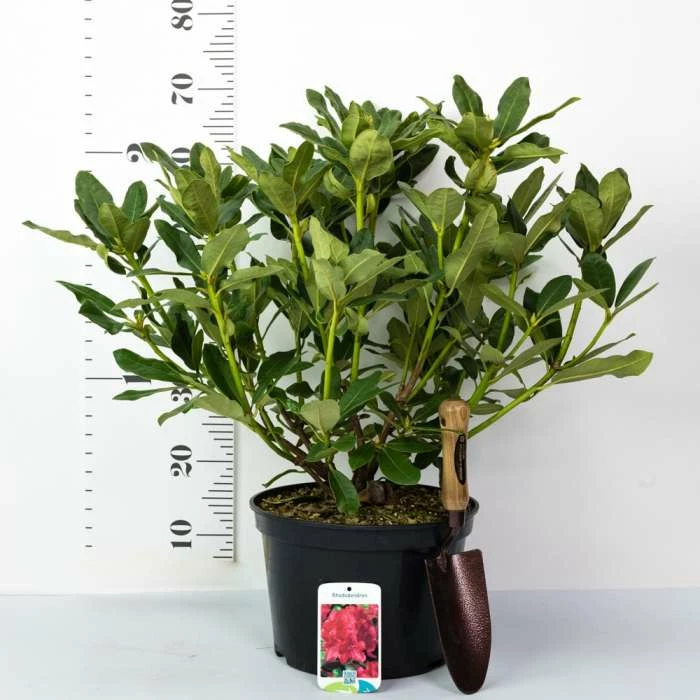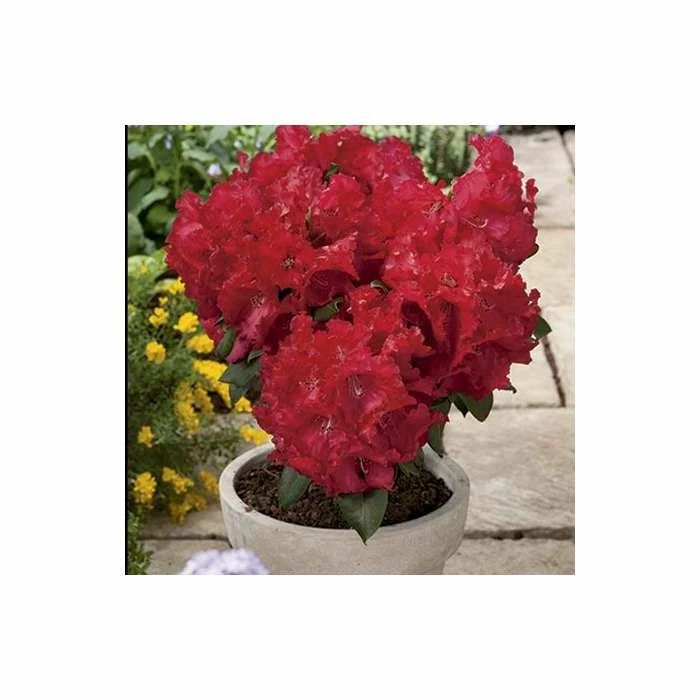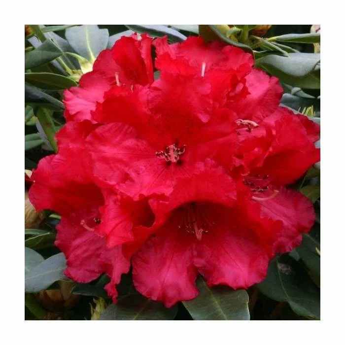 Huge scarlet red flowers in early May. Broad growing evergreen shrub. Impressive in both large borders and informal areas of your garden.