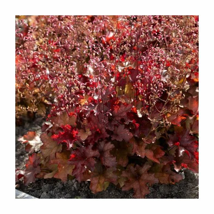 Heuchera ‘Indian Summer Cranberry’ will develop cranberry-coloured foliage, with leaves featuring beautifully crinkled and undulated margins. In early summer, small white flowers will emerge.